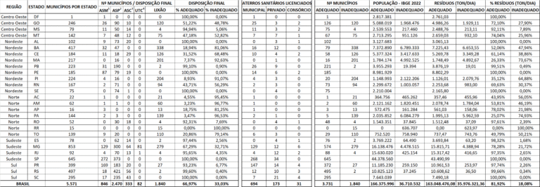 Em tempo, cabe esclarecer que a partir de Janeiro de 2025 o Brasil passou a ter 5.571 municípios. Boa Esperança do Norte, localizado no Mato Grosso não está representado no ATLAS RSU, no entanto realiza disposição adequada dos resíduos sólidos urbanos em aterro sanitário privado localizado em outro município.